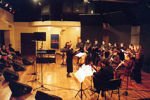 Silvia Sandoval junto a los integrantes de "Madrigal